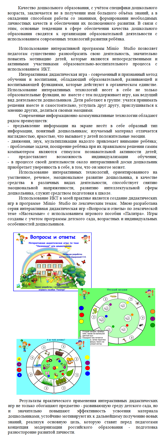 1. Инновационный продукт «Мимио-калейдоскоп» является Мимио-компьютерным практикумом, целью которого является развитие и коррекция речи у дошкольников, а также развитие интеллектуальных, познавательных и коммуникативных способностей детей, социализация дошкольников в современном мире. В основе практикума заложена компьютерная дидактическая игра.